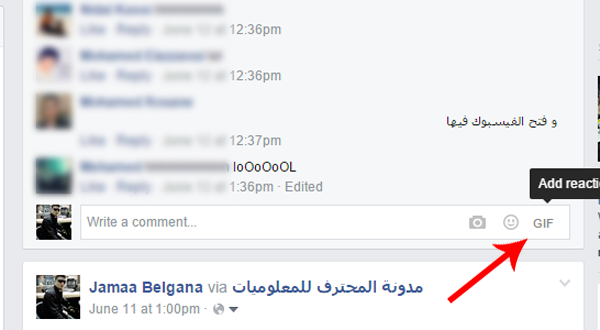كل ما عليك هو تحميل الاضافة ( رابط التحميل أسفل التدوينة ) وبعد ذلك ستلاحظ ظهور زر جديد “GIF ” في نافذة التعليقات على الفيسبوك تماما كما في الصورة .