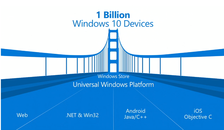مايكروسوفت كشفت كذلك عن متجرها الإلكتروني الجديد حيث أصبح منصة عالمية و سيمكن المطورين من تطوير تطبيقات من أنواع و بلغات البرمجة المختلفة، كما أن مايكروسوفت تطمح إلى جذب مطوري أنظمة أندرويد و iOS حيث ستسمح لمطوري أندرويد باستعمال Java و C ++ بالنسبة لتطبيقاتهم على ويندوز 10 و نفس الشيء بالنسبة لمطوري iOS الذين سيتمكنون من استعمال Objective C.