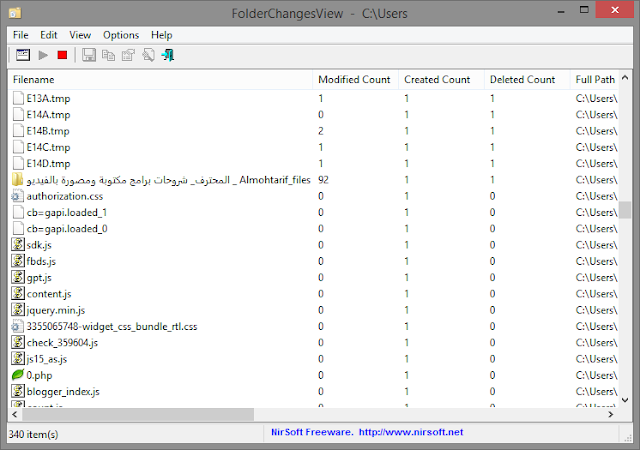 اذا كان هناك شخص يستخدم جهازك أو إذا كنت تريد معرفة مالتغيرات التي حدثت على ملفاتك ومجلداتك خلال وقت معين ، تستطيع استخدام برنامج FolderChangesView من Nirsoft .مجموعة Nirsoft لديها العديد من البرامج الجيدة والتي توفر لك الأداوت البسيطة المفيدة لجهازك، وأفضل مافي برامجهم أن لا يجعلون بها “Crapware” أو “برامج قبل التنصيب“ مثل البرامج الإعلامية والإعلانية والتي الكثير من كاتبي البرامج يستخدمونها لتدر لهم المبالغ .
