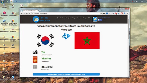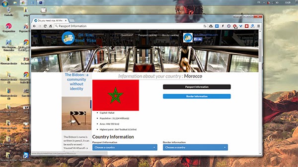 البلدان التي يمكنك زيارتها دون الحاجة للتأشيرة ومدة الزيارة المسموح بها ،لتعرف هذه البلدان يكفي ان تقوم بالنقر على “Passport Information” في الصفحة الرئيسية .كما يمكنك البحث واختيار البلد من القائمة المنسدلة :